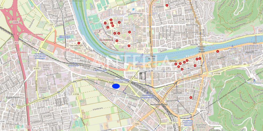 Die Bahnstadt ist eines der größten Stadtentwicklungsprojekte in Deutschland. Sie bietet neben hochwertigem Wohnraum, moderne energieeffiziente Gewerbeflächen und optimale Arbeitsbedingungen für Wissenschaft und Wirtschaft. Namhafte Unternehmen wie Reckitt Benckiser oder Heidelberg Engineering haben ihren Unternehmensstandort bereits in die Bahnstadt verlegt. Die Infrastruktur an diesem Standort ist hervorragend. Die Straßenbahnhaltestelle Gadamer Platz ist in wenigen Gehminuten erreicht. Hier besteht mit der Linie 22 Anbindung an die Heidelberger Innenstadt (Haltestelle „Bismarckplatz“). Der HBF Heidelberg ist ebenfalls in wenigen Minuten fußläufig erreichbar. Dort besteht Anschluß an das gesamte öffentliche Verkehrsnetz. Die Autobahnen A5 und A6 sind über die A656 optimal erreichbar.